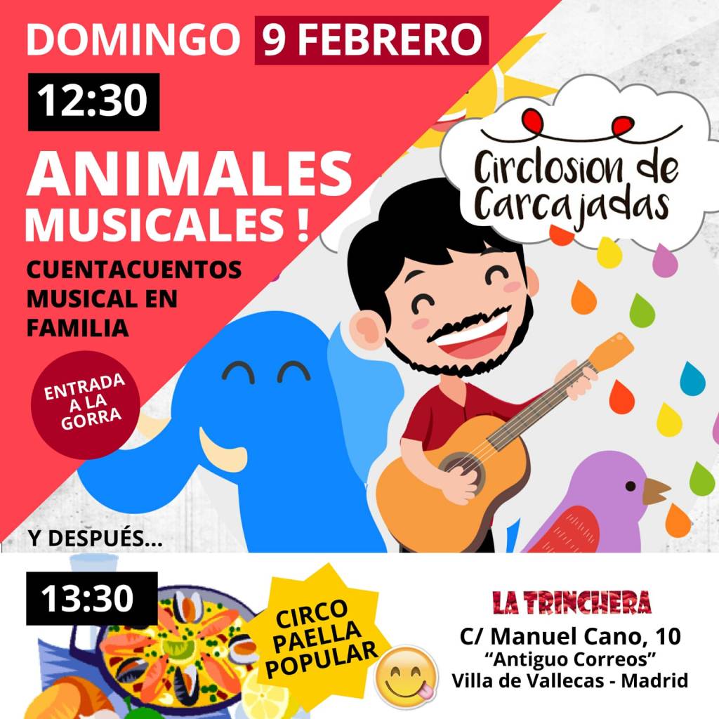 Domingo 9 de febrero, 12h30-15h: CUENTACUENTOS MUSICAL EN FAMILIA «Animales musicales», en Centro Social La Trinchera (C/Manuel Cano, 10 «antiguo correos», Villa de Vallecas). Entrada «a la gorra» (sé generoso). Compañía Circlosión de Carcajadas. Y después, a la 13h30: CIRCO PAELLA POPULAR