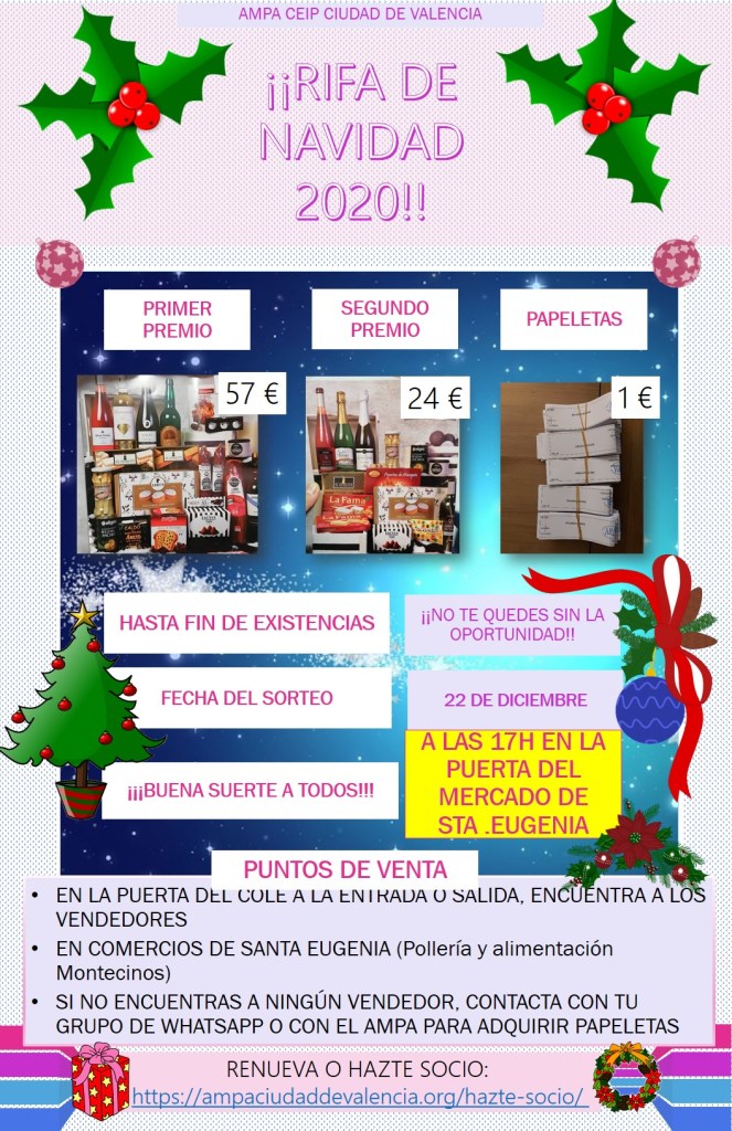 Sorteo cestas Navidad: 22 de diciembre a las 17h en la puerta del mercado de Sta. Eugenia Organizado por la Comisión de Festejos del AMPA: Comparte: Compartir en X (Se abre en una ventana nueva) X Compartir en Facebook (Se abre en una ventana nueva) Facebook Me gusta Cargando... Deja un comentario Cancelar la respuesta Δ