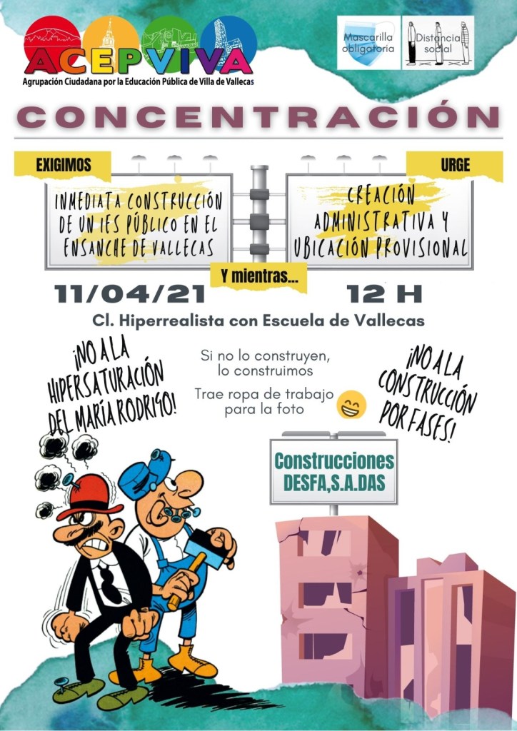 👉 CONCENTRACIÓN 11/04/21 – 12.00 HORAS en la parcela donde se ubicará el futuro IES (Cl. Hiperrealista con Cl. Escuela de Vallecas) https://goo.gl/maps/8BoT5TCekig4pZgy6