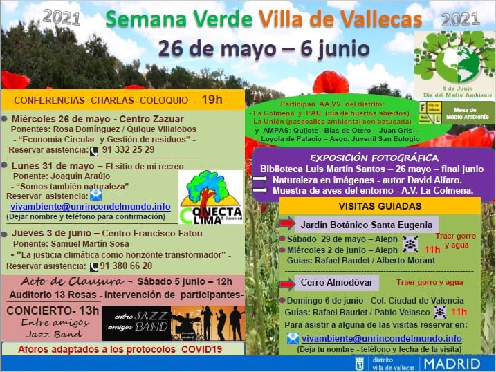 Aquí tenéis toda la información sobre las actividades de la Semana Verde de Villa de Vallecas organizada por el Ayuntamiento, del 26 de mayo al 6 de junio, que incluye charlas, concierto, exposición fotográfica y visitas guiadas al Jardín Botánico de Santa Eugenia y al Cerro Almodóvar. Las visitas serán guiadas por Rafa Baudet, forestal especializado en la flora diversa y autóctona, y Alberto Morant, en el caso del Jardín Botánico de Santa Eugenia ya que ambos participaron en el grupo promotor de este bonito proyecto; y de Rafa y Pablo Velasco, presidente de la A.V. La Colmena, en el caso del Cerro Almodóvar.