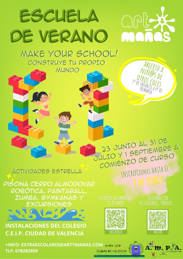 📆 Inscripciones hasta el *9 de junio incluido* a través del siguiente enlace seleccionando CAMPAMENTOS y ESCUELA DE VERANO CEIP CIUDAD DE VALENCIA: https://artymanas.com/login/